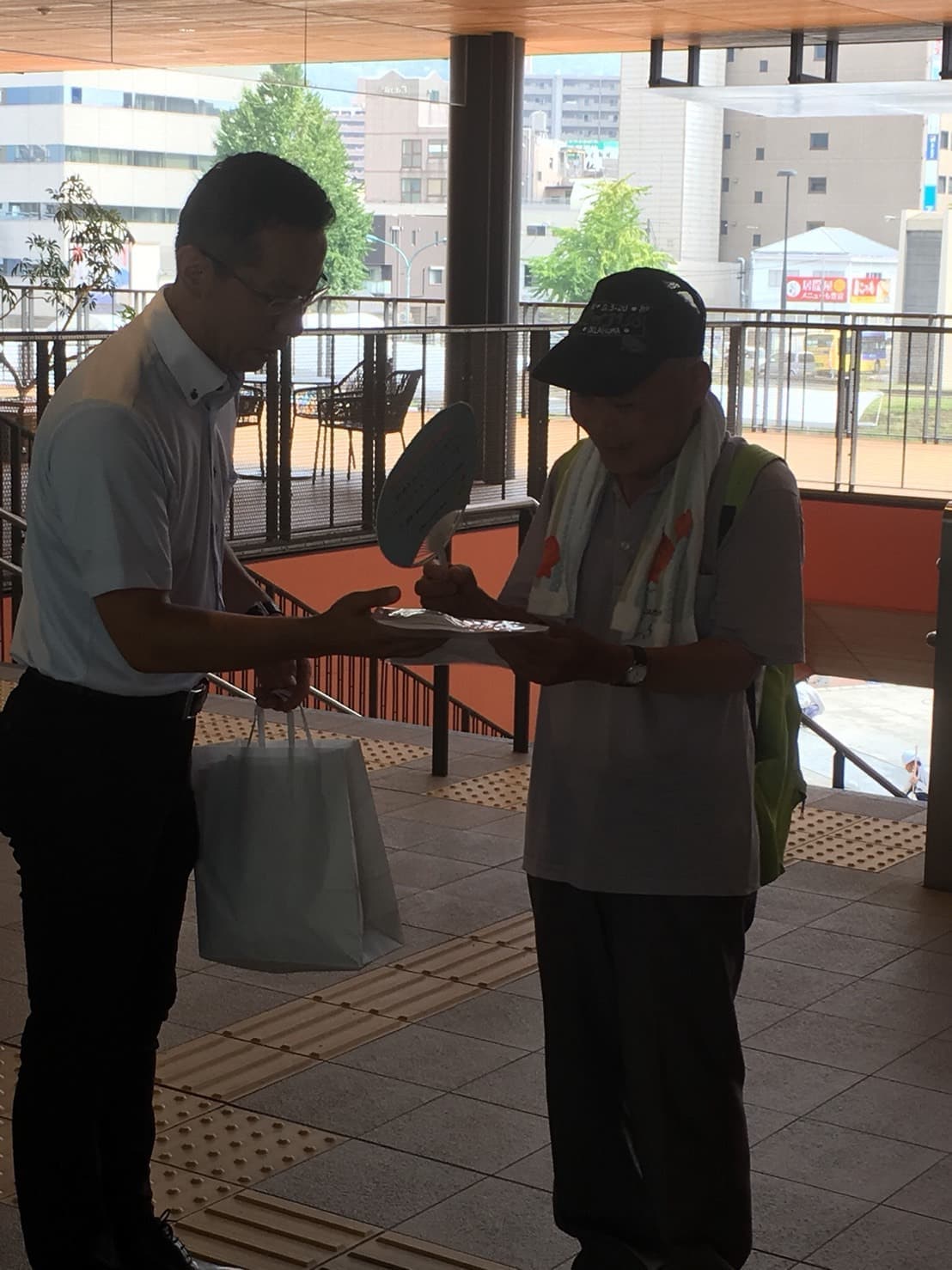 役員の方々にご挨拶をさせていただきました。市政施行80周年のお祝いまんじゅうもオリジナルで作られて600個先着順で配布されます。曇り空の一日となりそうですが雨が降らず、素晴らしいお祭りになりますように!