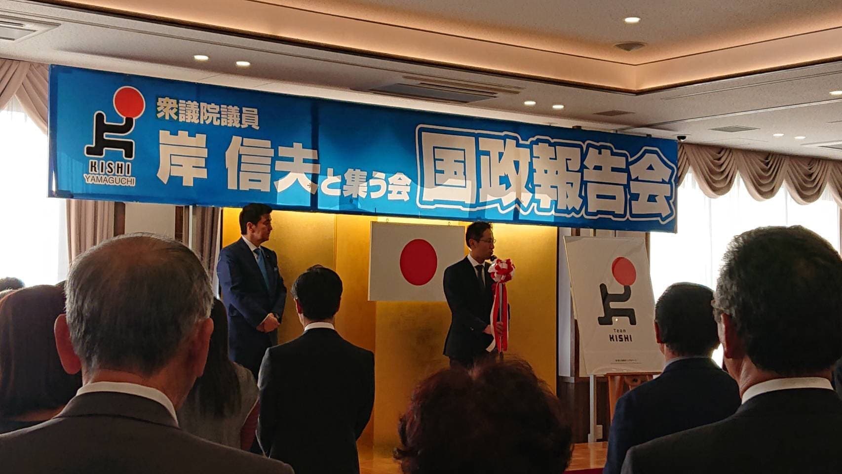 山口から急いで戻り、夕方からは衆議院議員 岸信夫代議士の国政報告会へ‼️ご挨拶の場をいただきありがとうございました😊多くの皆様が出席され盛大に開催されました事心からお喜び申し上げます。